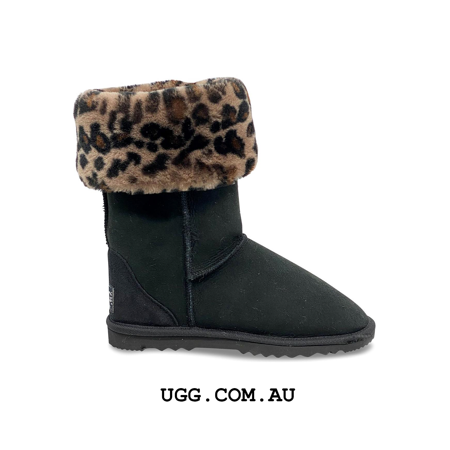 A mid-calf length boot with a wild side. The Leopard Cuff features an unique print on the fluffy sheepskin that spills over the top.